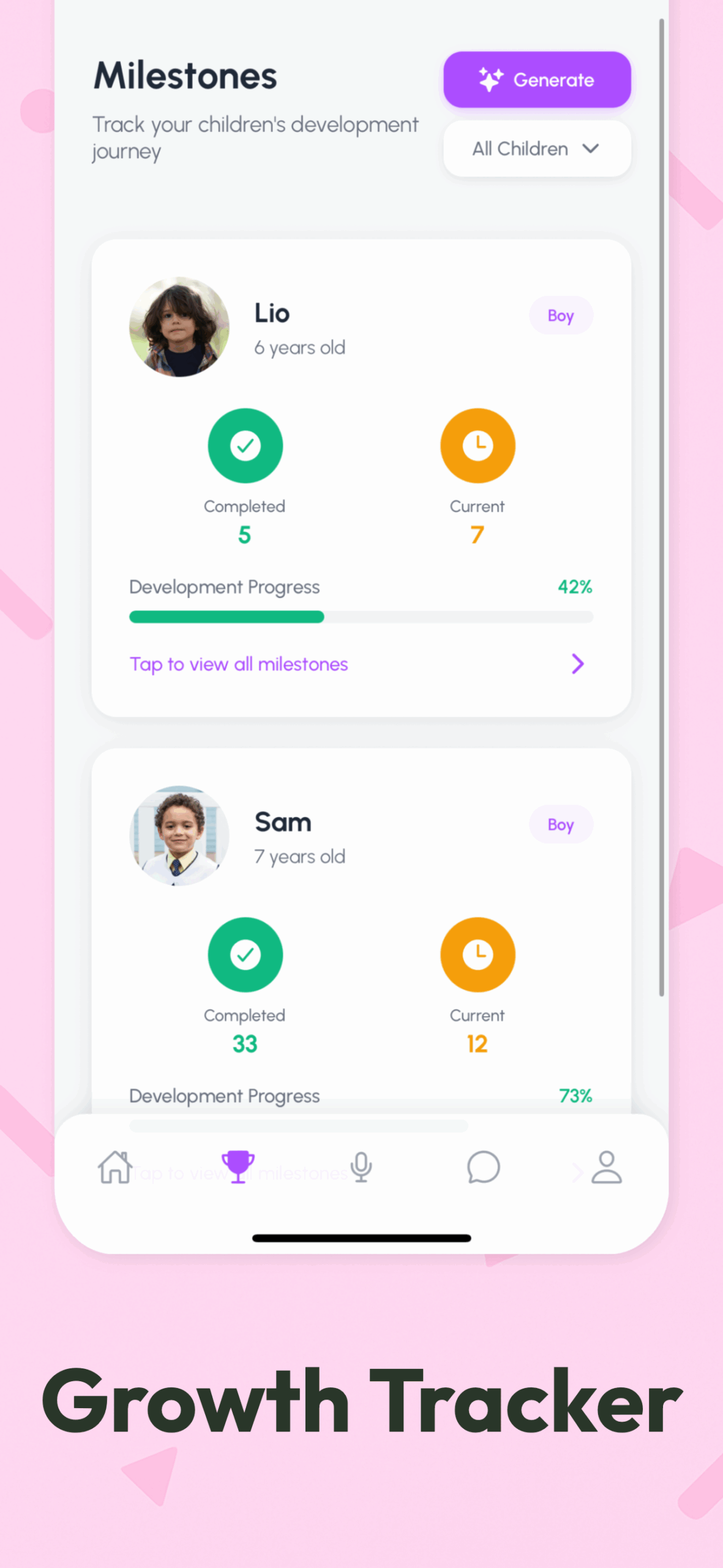 Log sleep, moods, growth, and achievements; get gentle alerts if something needs attention.Play & Learn Generator